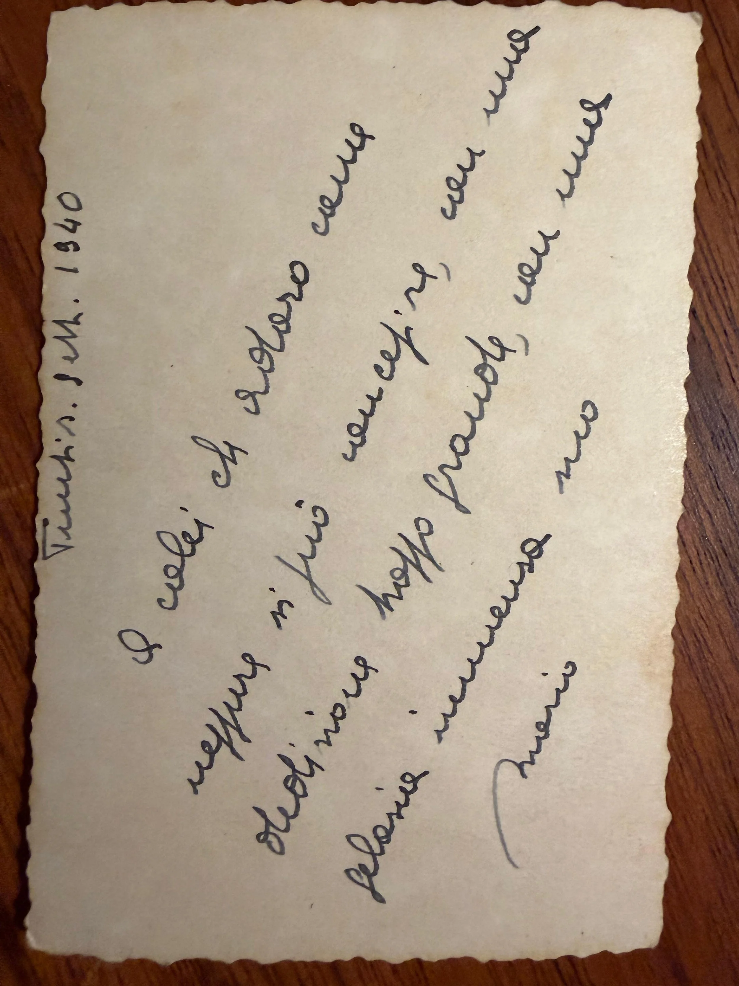 He had a profound love for literature and language, wrote beautifully, and possessed the sharp, playful wit of a true Tuscan man: ironic, occasionally biting, always intelligent. Very sharp. A man of great culture and rhetorical skill, he was a natural storyteller, someone people loved to listen to, including us grandchildren. He was fascinated by meteorology, by clouds and the changing skies, and he could read the weather as if it were a living text. He also drew exceptionally well, and in his youth was strikingly handsome - often compared, later on, to Marcello Mastroianni.