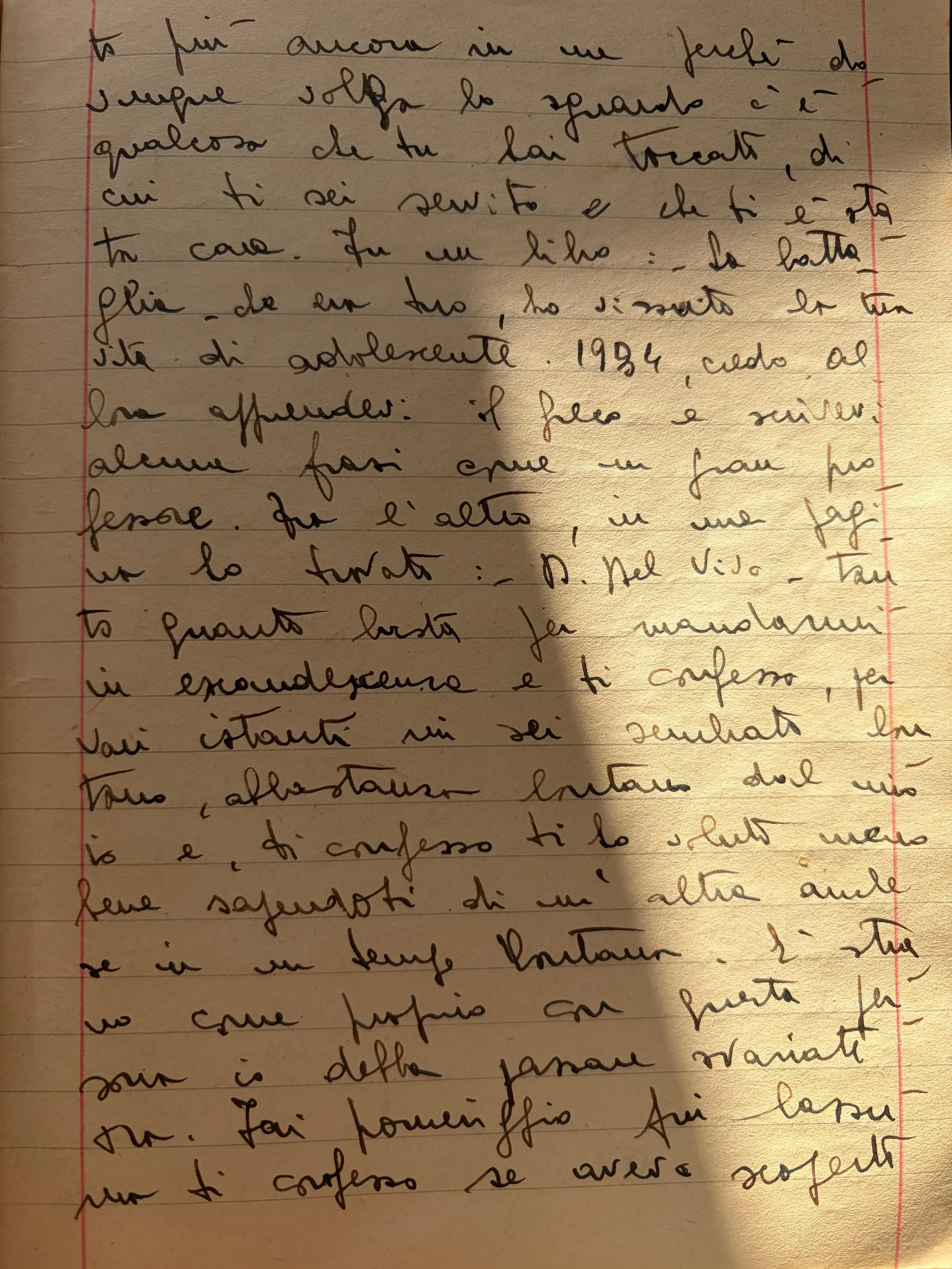 In un libro '“La Battaglia”, che era tuo, ho vissuto la tua vita da adolescente: 1934, credo, allora apprendevi il greco e scrivevi alcune frasi come un gran professore. Tra l’altro in una pagina ho trovato “D. Del Vivo”, tanto quanto basta per mandarmi in escandescenza e ti confesso per vari istanti mi sei sembrato lontanto, abbastanza lontanto dal mio e, ti confesso, ti ho voluto meno bene sapendoti di un’altra anche se in un tempo lontano. E’ strano come proprio con questa persona io debba svariate ore.