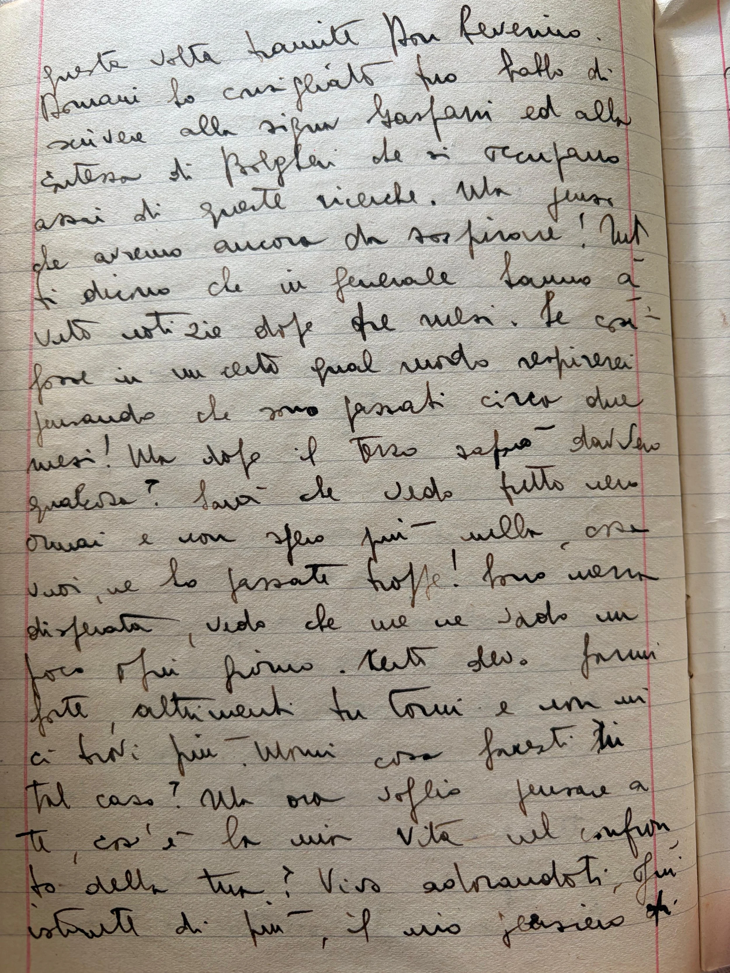 Stanotte ti ho sognato, per la terza o quarta volta credo, da quando sei partito. Mi trovavo in una città mai vista e chiedevo a tutti se erano arrivati i prigionieri. Mi indicano un palazo. Entro, vi erano molti giovani, quasi tutti in apparenti buone condizioni, domando se ti conoscono, mi dicono di andare avanti. Cammino ed incontro uno che mi sembrava ti somigliasse, poi chiamo, ti bacio, ma non eri tu… Continuo a camminare tra tutta questa gente e finalmente ti vedo! Mi vieni incontro e ci salutiamo con molta commozione. Eri in divisa e stavi proprio bene. Ti faccio tante domande e mi tranquillizzi. Ma mi chiedi come mai mi ero messa in testa che tu fossi prigoniero? Lo vedi come sto? Benissimo. Ho il mio stipendio, la mia divisa… Dici poi che ci sono dei particolari che non voglio descrivere ma che ti hanno fatto apparire meno mio. Ma questo oggi, te lo confesso, è il meno. Ho paura di ben più serie cose, vorrei che tornassi da me, presto - poi, farti essere più o meno mio dipenderebbe da me. Ieri scrissi a Don Severino pregandolo se potesse aiutarmi dandomi tue notizie. Ma chissà. Sai, lui è con i Tedeschi! Speriamo in bene, tesoro. Certo il mondo è brutto, penso già alla prossima avanzata. Dio mio, gli Australiani e i Neo Zelandesi! Ci risparmieranno?