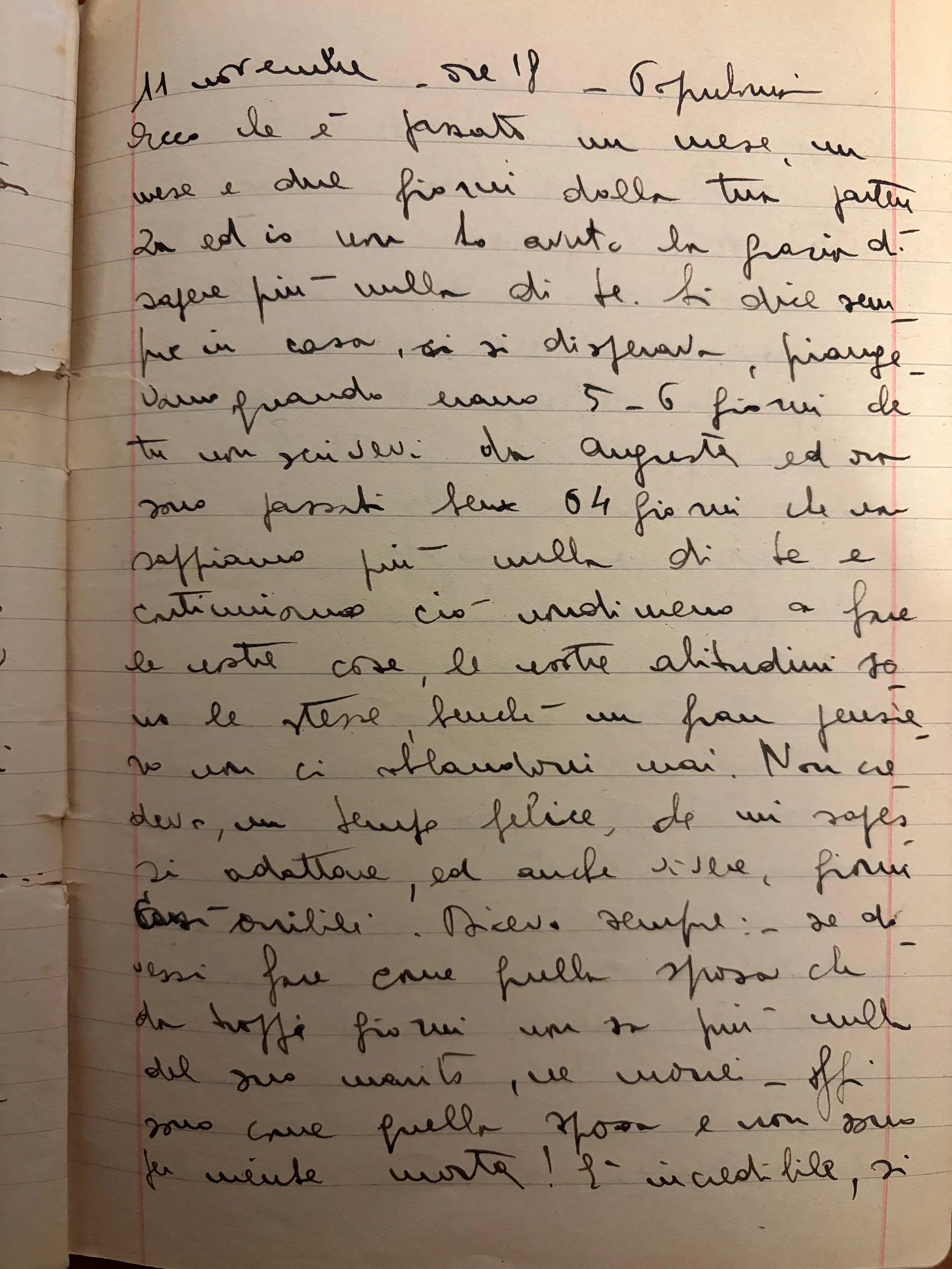Ora penso che cominceremo a vivere la guerra. Speriamo in bene, vorrei solo poterti rivedere, anche se mi ammazzassero. Come ci siamo ritrovati Mario. Ed anche tu come starai in pensiero guardando alla catastrofe che si avvicina a noi. Mario mio speriamo in Dio, ma c’è anche da perdere la fede, ma è possibile questo sfacelo? Ti penso tanto e dico che almeno ti avessi vicino si affronterebbe insieme il momento, ma così sola penso che tu solamente potresti difendermi.